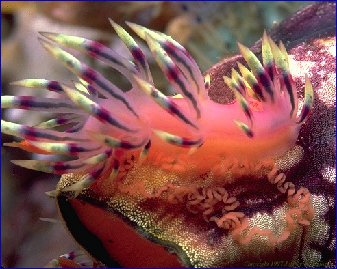 Here's Flabellina expotata in the process of laying eggs on a tunicate. The characteristic orange rhinophores are partially visible in the left central portion of the photo. Click here to go to the previous page
