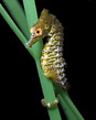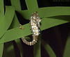 Familiarity with the size of the blades of seagrass compared to the other seahorses featured on this site illustrates the relatively tiny stature of this dwarf seahorse. Though this appears to be a young one, these seahorses only reach an adult length of about 2.5 cm (one inch). Their life expectancy is shorter than the larger breeds, at about 1-2 years. Their snout is also shorter in comparison to its head length, compared to most other species. Update May 2012: Smallest seahorse in US waters might get endangered protection Identification: Hippocampus zosterae